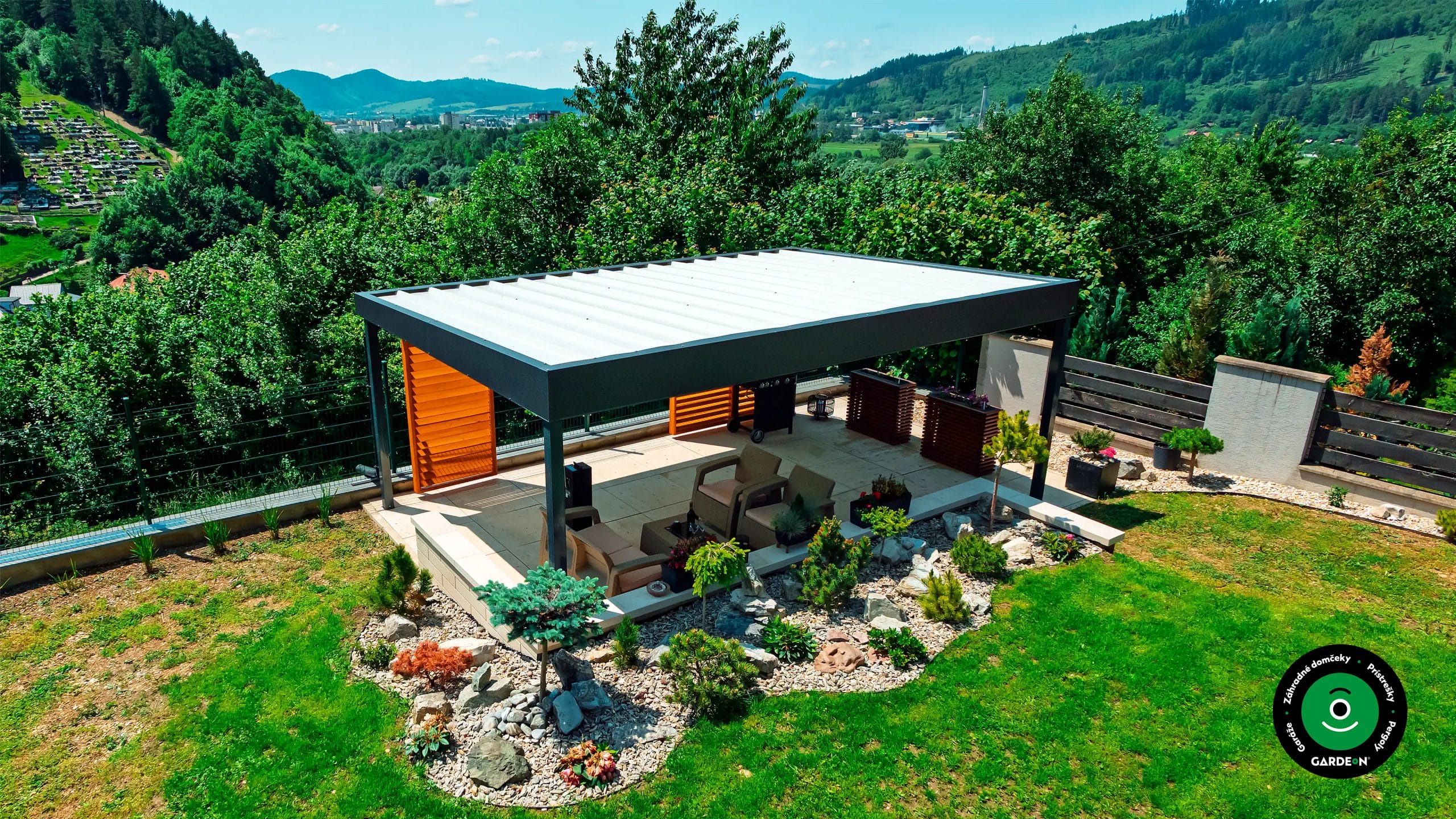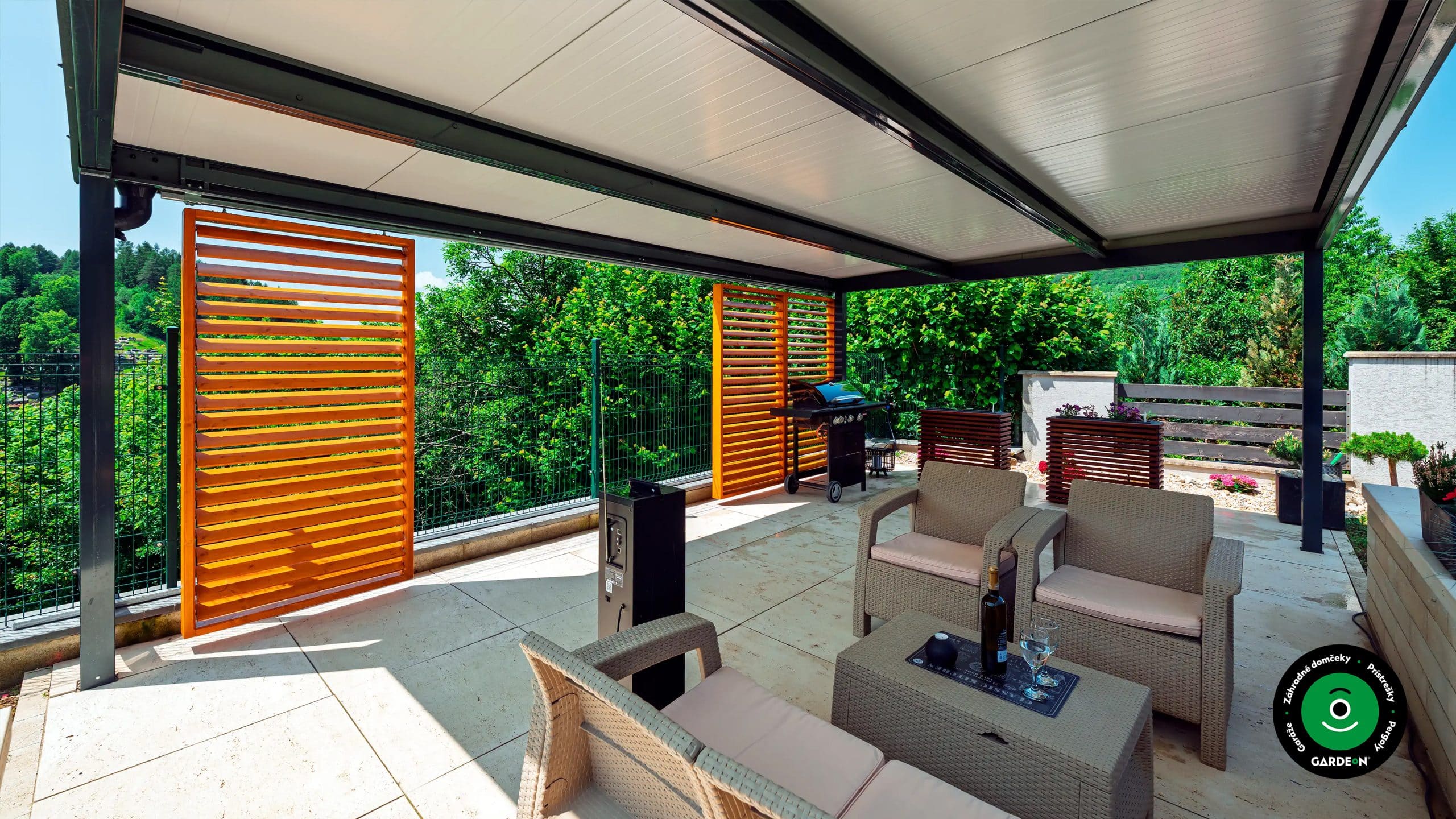 Tienená pergola s príjemným posedením Pergola s bočným tienením a posedením pre hostí