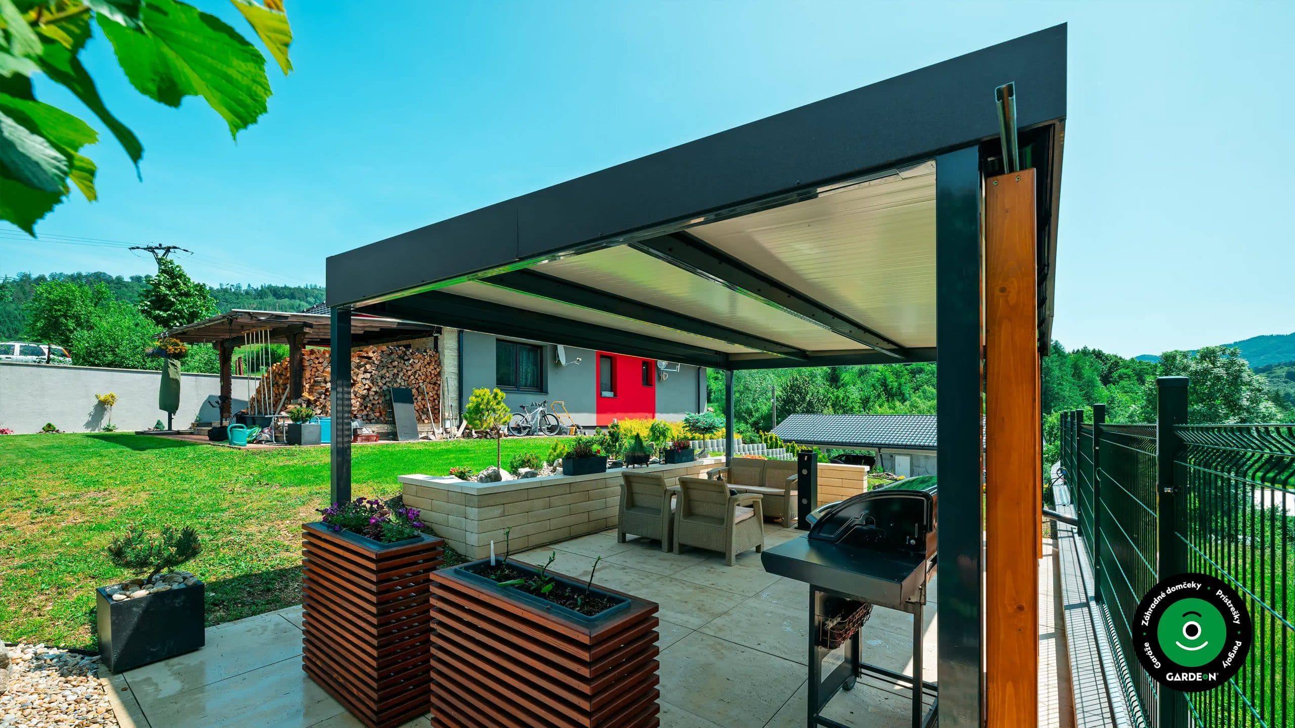 Pergola GARDEON v záhrade hneď vedľa bieleho domu.