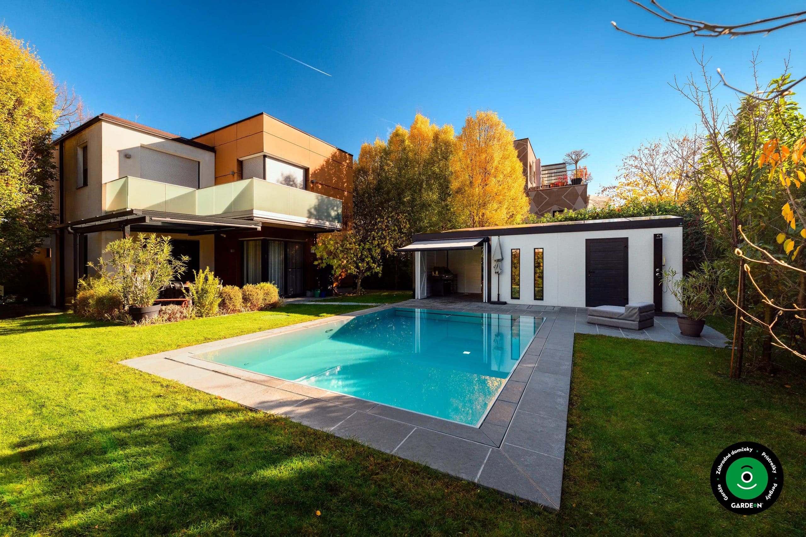 Elegantná pergola s bazénom a udržiavaným trávnikom.