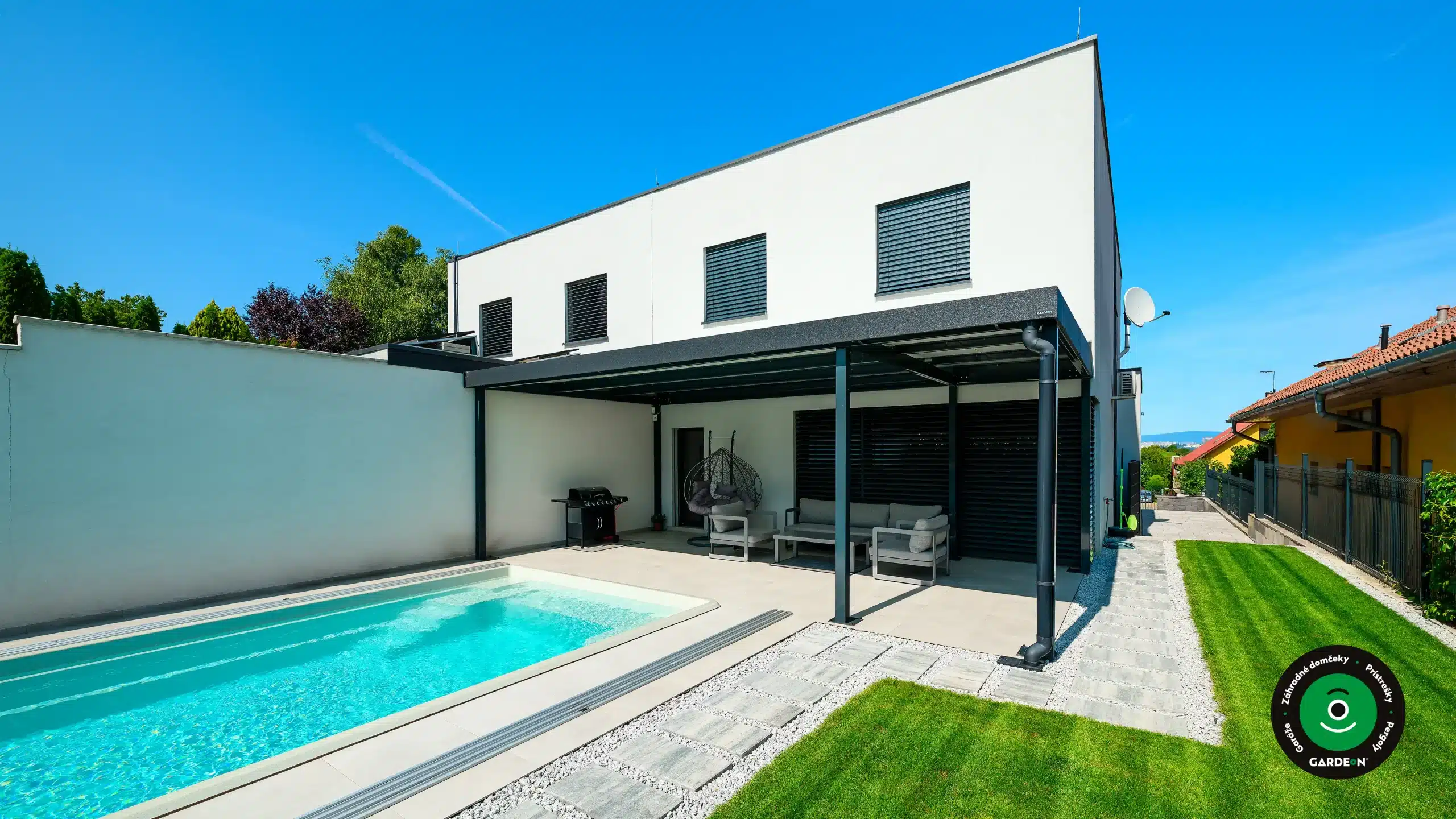 Elegantná pergola s bazénom a udržiavaným trávnikom.