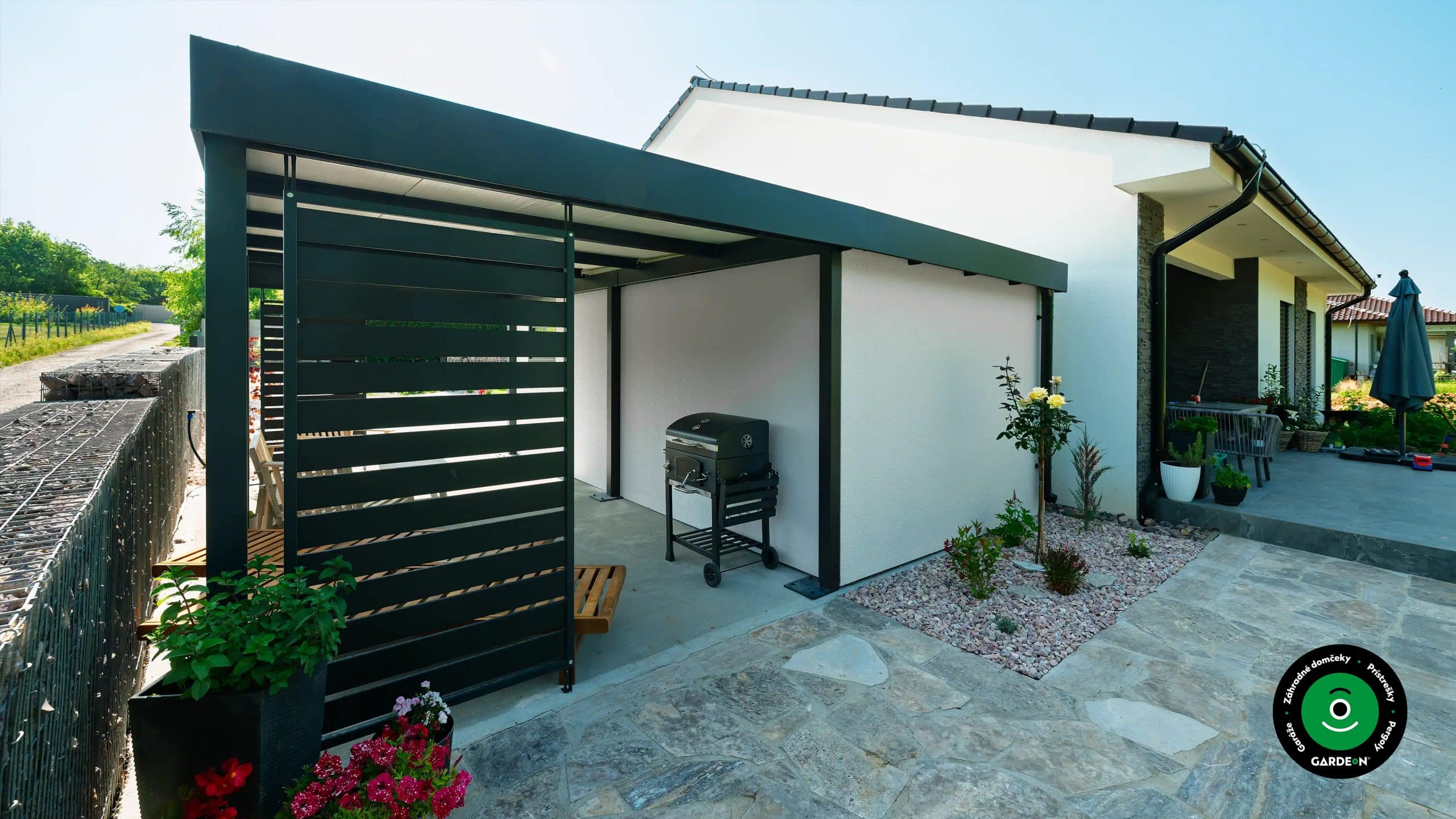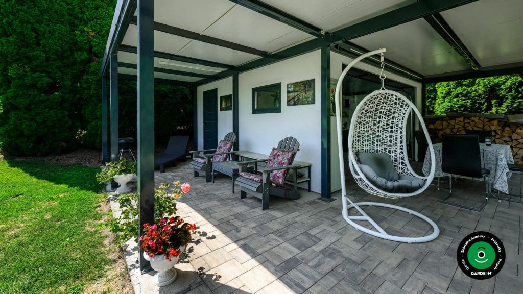 Ďalšie praktické riešenie predstavuje kombinácia prístrešku a záhradného domčeka. V záhradnom domčeku tak môžete mať zariadenú napríklad jednoduchú letnú kuchynku, alebo aspoň miesto na uloženie vecí potrebných na servírovanie. V tomto prípade si majitelia zvolili priestrannejší záhradný domček Gardeon s garážovou bránou, takže sa v ňom dá okrem iného aj pohodlne zaparkovať kosačka, vertikutátor či drvič konárov, prípadne tiež bicykle alebo motorka.